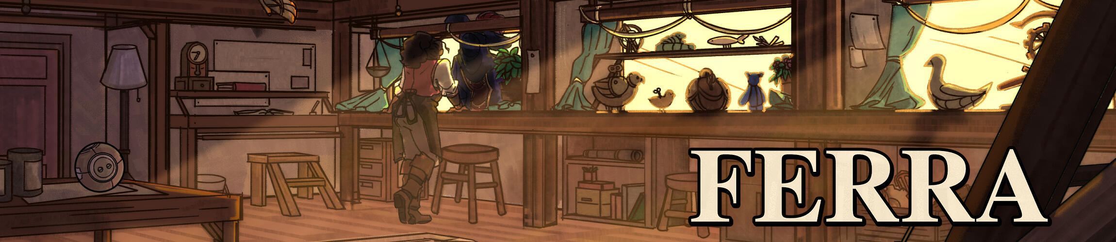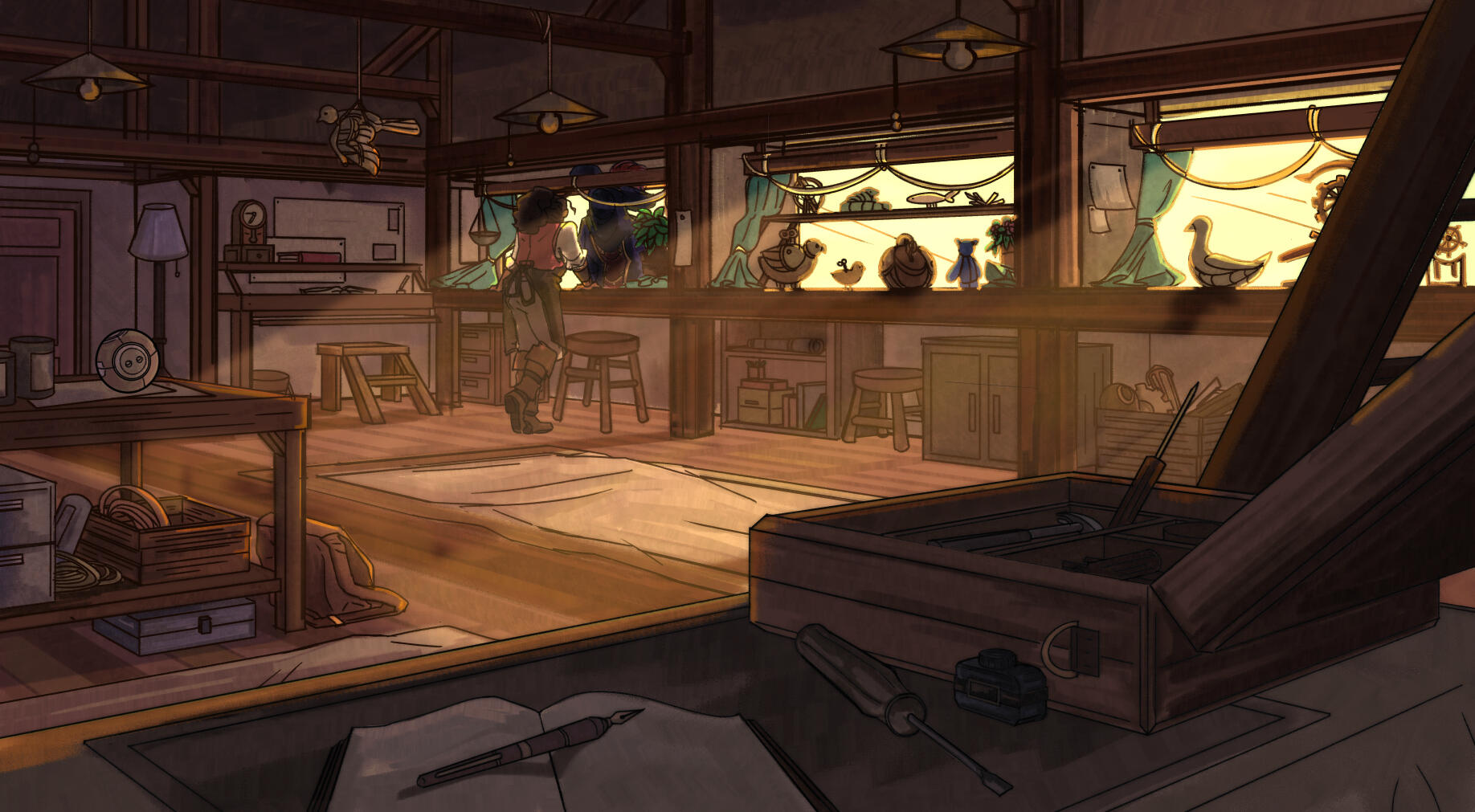 Interior shot of Juno's workshop/toy store, acting as a safe zone and upgrade area for Ferra